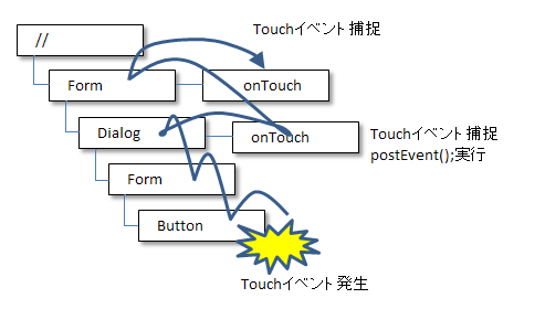 しかし、はじめからButtonにフォーカスがあるときGetFocusは発生しません。 また、onGetFocusイベントハンドラ内で、ユーザ定義イベントを発行したとき、Touchイベントとユーザ定義イベントのどちらが先にイベントキューに格納されるかは不定です。 これは、Touchイベントの発生要因となる、マウスボタンを離す操作と、CRSスクリプトの実行でpostEventメソッドを実行する処理で、 どちらが先に行われるかを決定する事ができないためです。