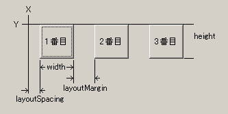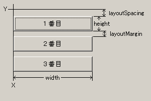 Layoutプロパティは、オブジェクトのレイアウト方法をあらわします。LayoutMarginは表示間隔、LayoutSpacingは余白とする大きさを示します。