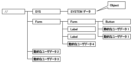 Rootオブジェクトの子オブジェクトとして「SYSオブジェクト」(システムデータ)が常に存在し、その他にアプリケーションによって定義される画面やデータを表すオブジェクトが存在します。