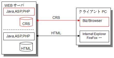 HTMLとWEBブラウザを使ったシステムとの唯一の違いは、HTMLではなくCRSをWEBサーバからダウンロードして動作する点です。