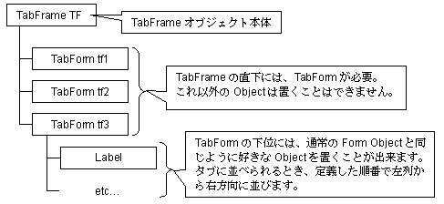 TabFrameオブジェクトの下位に定められた構造でTabFormクラスまたはその派生クラスのオブジェクトを配置する必要があります。