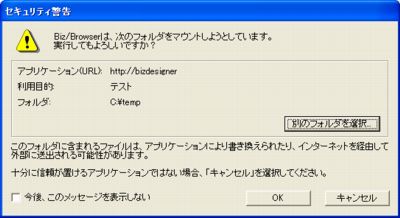セキュリティ警告ダイアログで「今後、このメッセージを表示しない」をチェックしてOKを選択した場合、以降のマウントでは後述のマウント情報の記録の条件が一致すれば、警告ダイアログを表示せずに前回と同じフォルダに自動的にマウントします。 ただし、フォルダが削除されていてアクセスできないなど、そのフォルダがマウントの対象として指定できない状態に変わっている場合は、再度セキュリティ警告ダイアログが表示されます。
