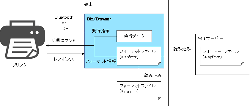ラベル印刷の発行には、「SmaPri Designer」で作成したフォーマットファイル(*.spfmtz)を利用します。Biz/Browser HTは、フォーマットファイルから読み込んだフォーマット情報と発行データから印刷コマンドを作成し、プリンタに発行を指示します。