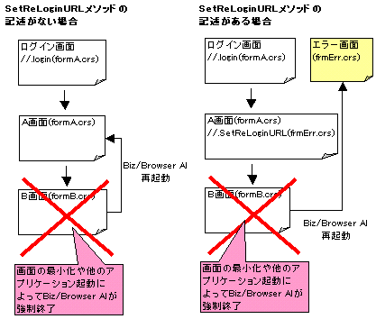 SetReLoginURLメソッドを利用する事によって、Biz/Browser AIが強制終了された場合にエラー画面や再ログイン画面へ遷移させるといった制御が可能となります。